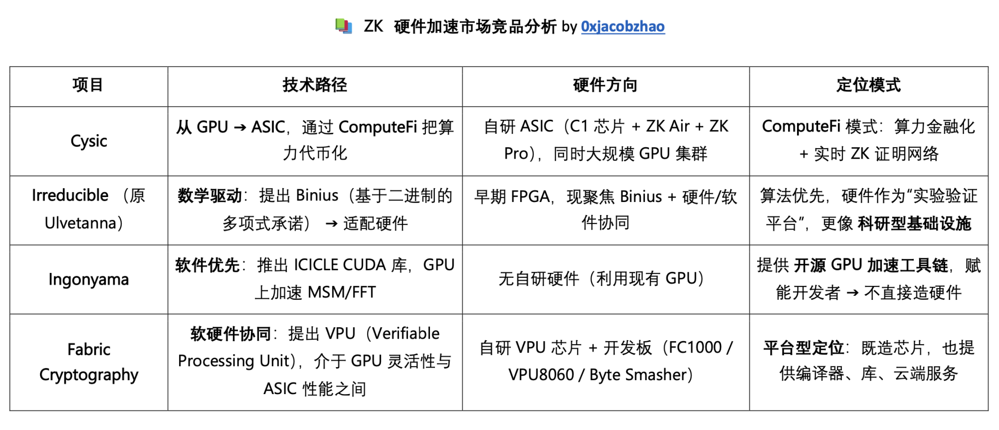 在硬件加速型 Prover 与 ComputeFi 赛道,Cysic 的核心对手包括 Ingonyama、Irreducible(前 Ulvetanna)、Fabric Cryptography、Supernational,均围绕「加速 ZK Proving 的硬件与网络」展开。