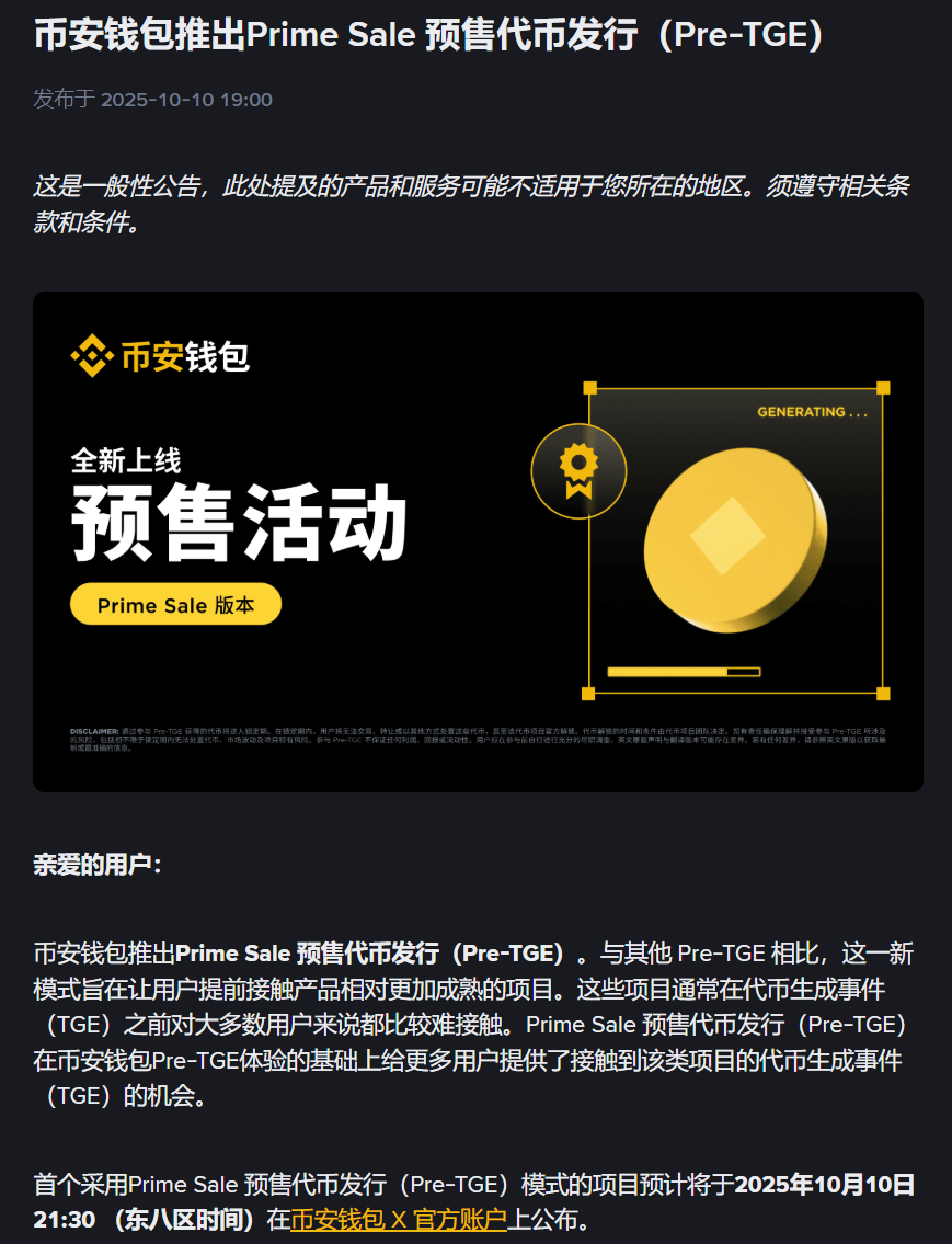 首个采用 Prime Sale 预售代币发行(Pre-TGE)模式的项目预计将于 2025 年 10 月 10 日 21:30(东八区时间)在 Binance 钱包 X 官方账户上公布。