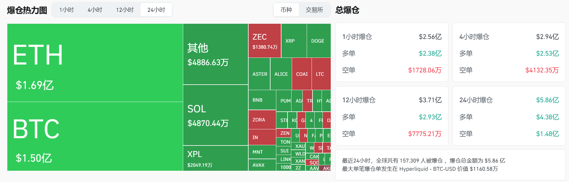 比特币爆仓金额达 1.50 亿美元,以太坊爆仓 1.69 亿美元。过去 24 小时内共有 157,309 人被爆仓,最大单笔爆仓出现在 Hyperliquid 的 BTC-USD 交易对上,价值 1160.58 万美元。