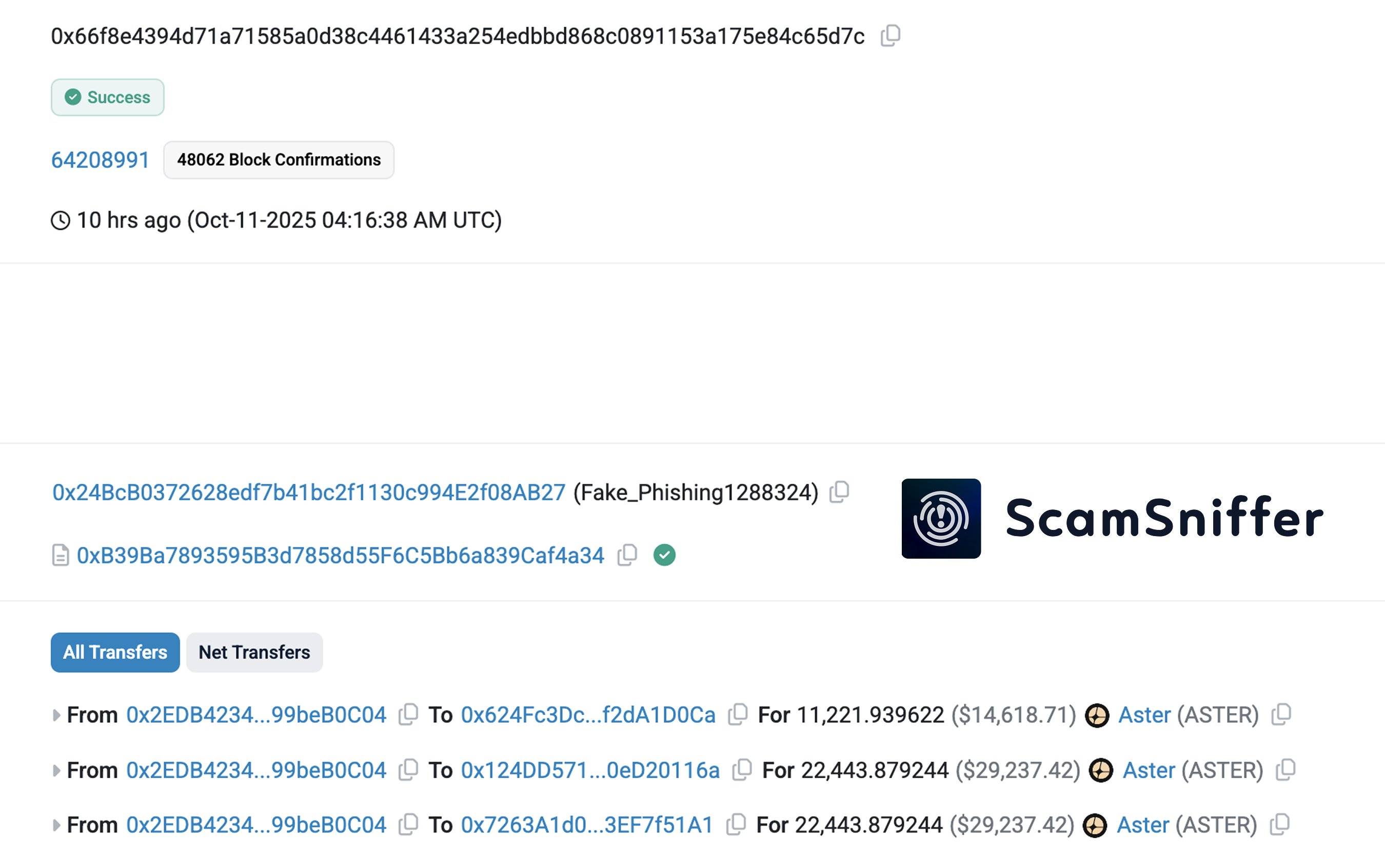 深潮 TechFlow 消息,10 月 11 日,据链上分析师 Scam Sniffer 监测,某用户因签署恶意 permit 签名损失价值 72,572 美元的 ASTER 代币。