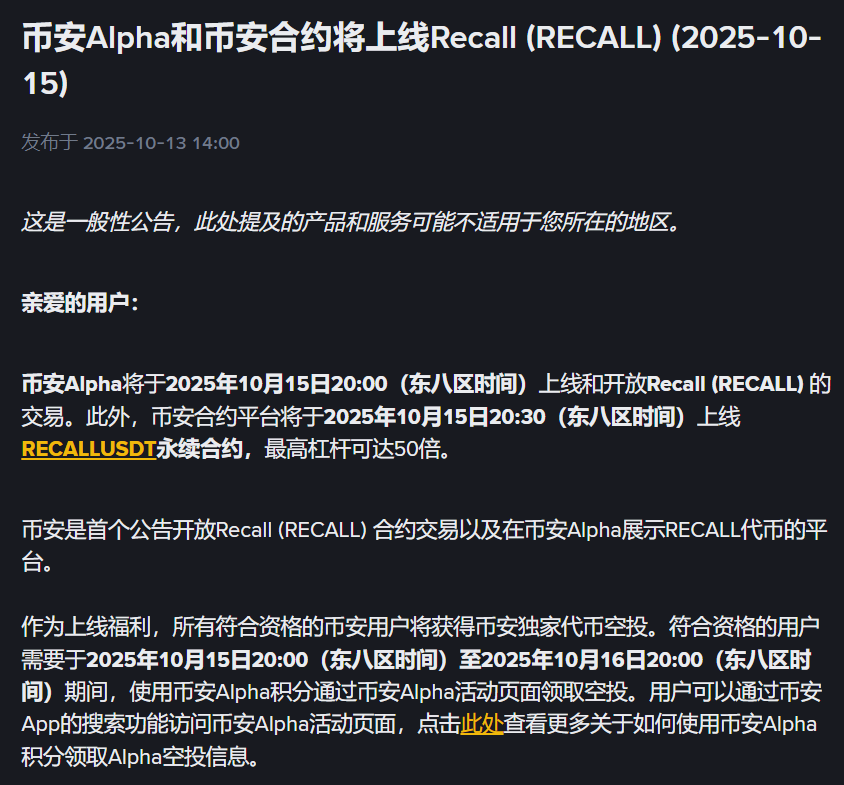 币安是首个公告开放Recall (RECALL) 合约交易以及在币安Alpha展示RECALL代币的平台。 作为上线福利,所有符合资格的币安用户将获得币安独家代币空投。符合资格的用户需要于2025年10月15日20:00(东八区时间)至2025年10月16日20:00(东八区时间)期间,使用币安Alpha积分通过币安Alpha活动页面领取空投。