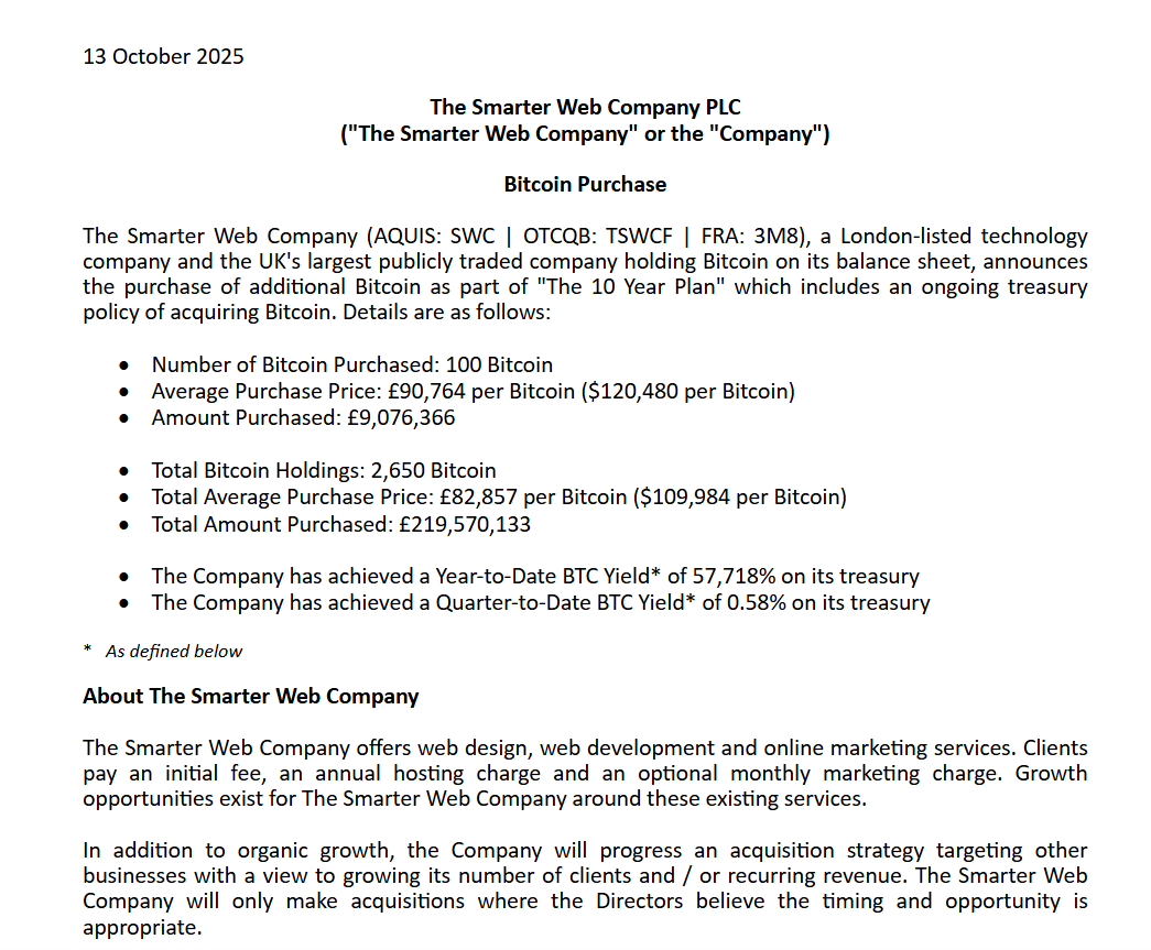 深潮 TechFlow 消息,10 月 13 日,据官方公告,英国上市公司 The Smarter Web Company 宣布增持 100 枚比特币,总持仓达 2650 枚。