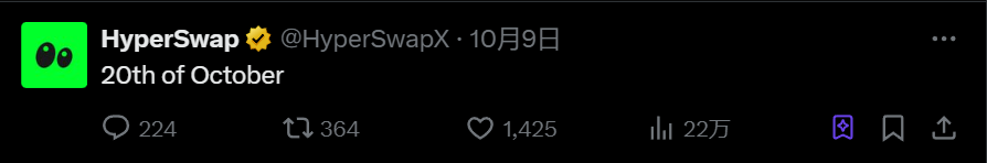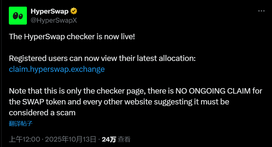 深潮 TechFlow 消息,10 月 13 日,据官方公告,Hyperliquid 生态 DEX 项目 HyperSwap 已上线空投查询工具,但申领暂未开放,此前 HyperSwap 曾发日期推文“10 月 20 日”,或暗示 TGE 日期为 10 月 20 日。