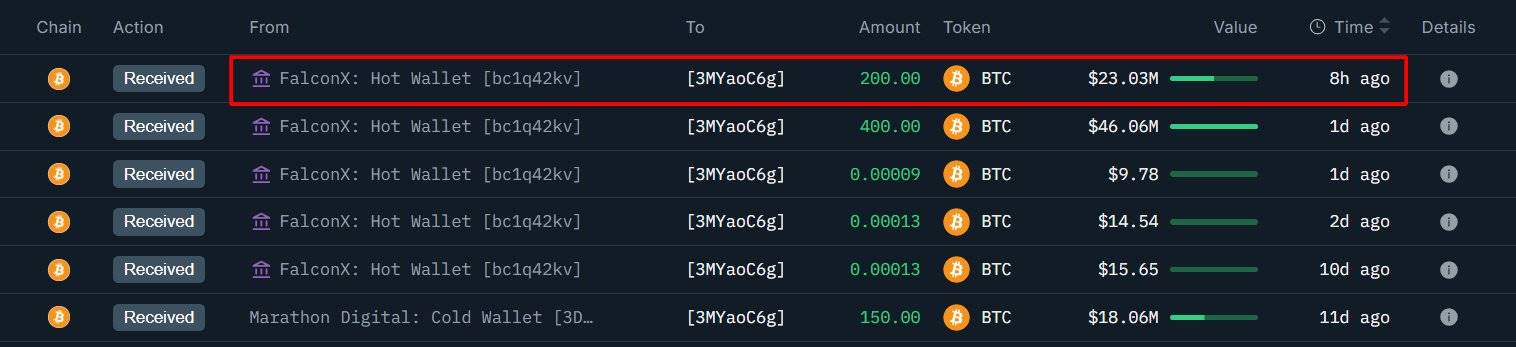 深潮 TechFlow 消息, 10 月 14 日,据链上分析师 Onchain Lens(@OnchainLens)监测,矿企 Mara Holdings(@MARA)钱包"3MYao"从 FalconX 购入 200 枚 BTC ,价值 2303 万美元。