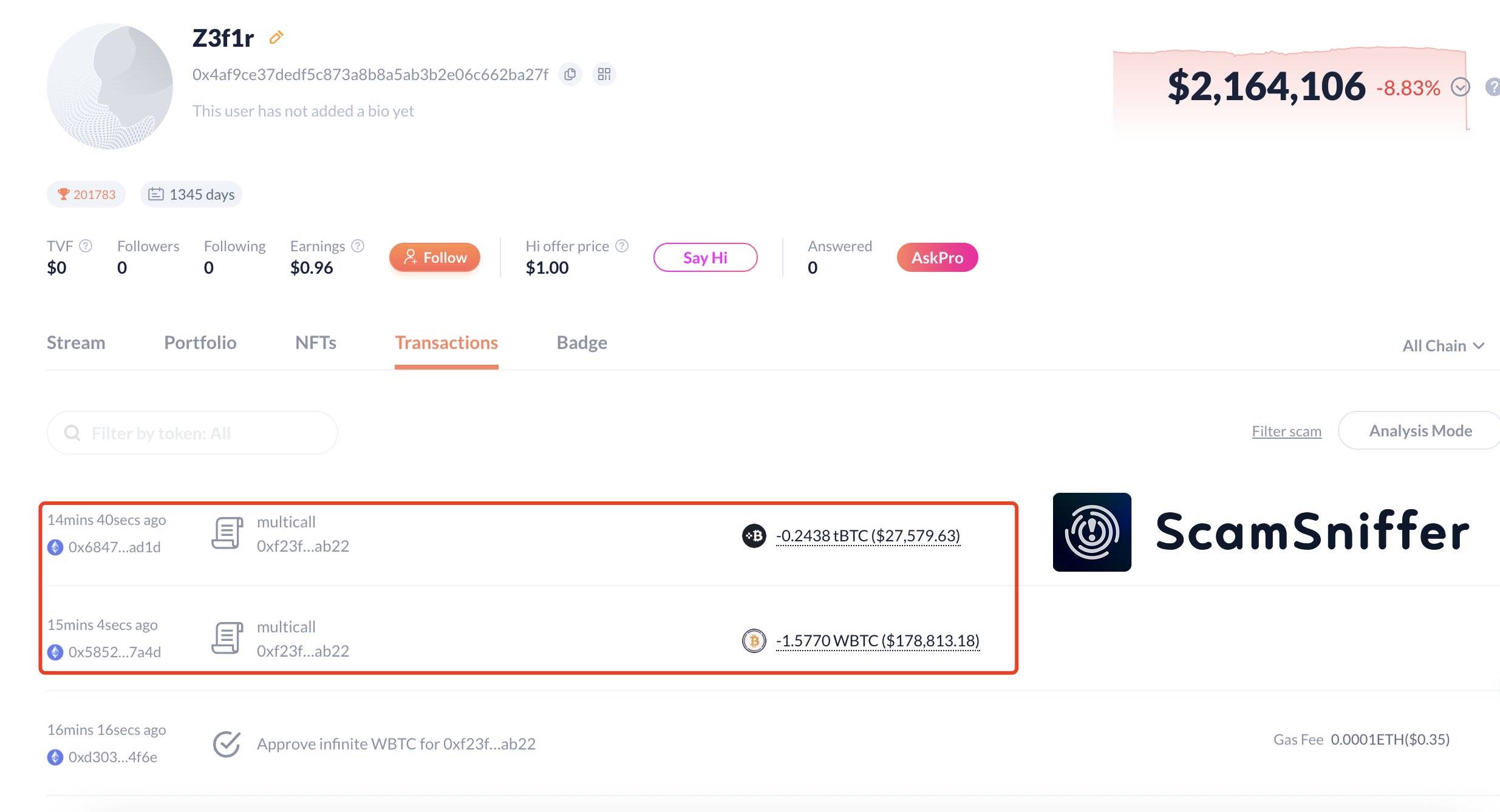 某用户因签署恶意授权损失价值 20.98 万美元的 WBTC 和 tBTC
