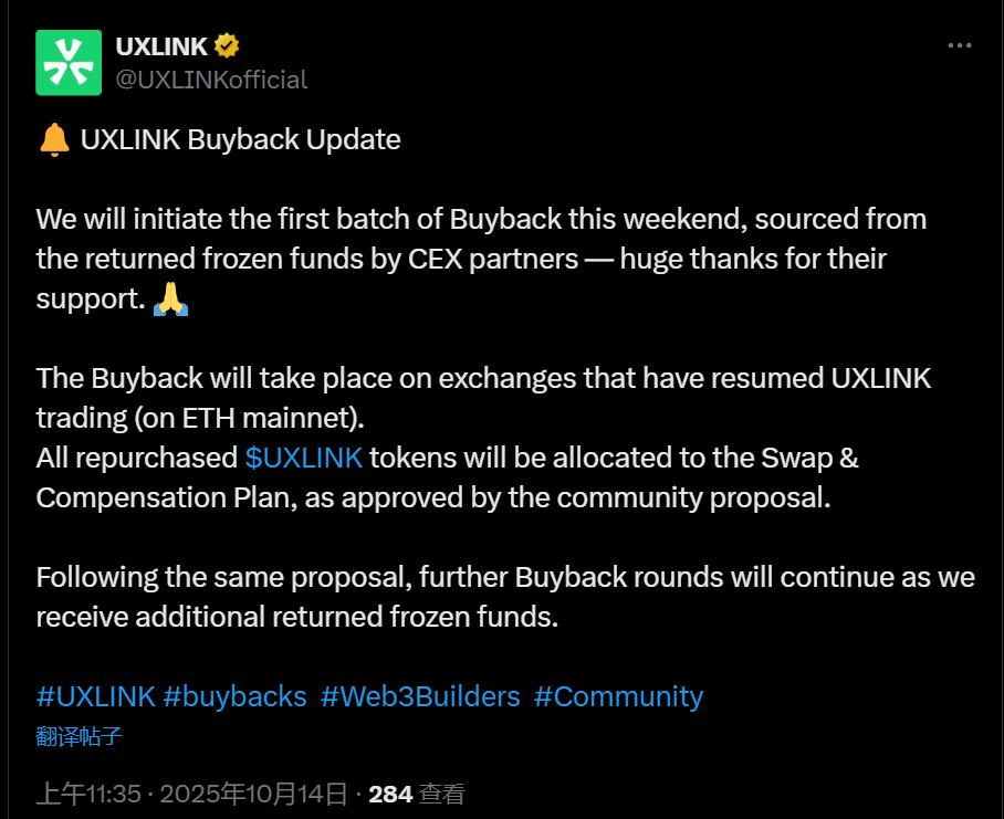 深潮 TechFlow 消息,10 月 14 日,据 UXLINK 官方披露,该项目将于本周末启动首批代币回购计划。