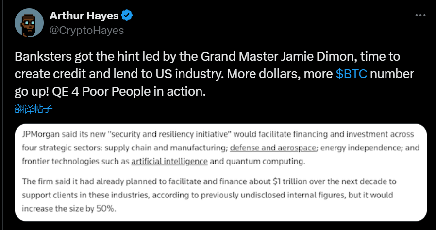 深潮 TechFlow 消息,10 月 14 日,BitMEX 联合创始人 Arthur Hayes 在社交媒体发文表示,以摩根大通首席执行官 Jamie Dimon 为首的银行家们已经得到暗示,开始创造信贷并向美国产业放贷。Hayes 认为,更多美元流入市场将推动 BTC 价格上涨。