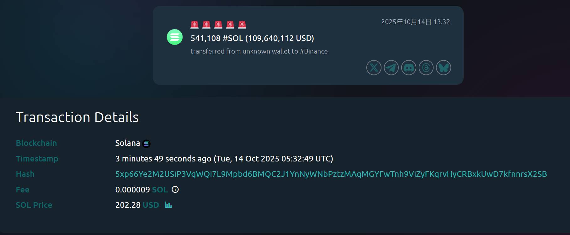 深潮 TechFlow 消息,10 月 14 日,据 Whale Alert 监测,某鲸鱼约 4 分钟前向币安交易所转入 541,108 枚 SOL,价值约 109,640,112 美元。