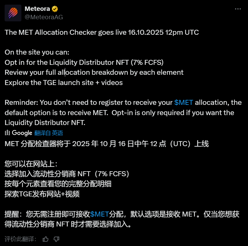深潮 TechFlow 消息,10 月 16 日,据 Meteora 官方披露,MET 代币空投分配检查器将于 UTC+8 时间今日 20 点正式上线。在该网站上,用户可以:1、选择参与流动性分发者 NFT,占比 7%,先到先得;2、查看每个元素的完整分配明细;3、浏览 TGE 上线网站及相关视频。用户无需注册即可领取 MET 分配,默认选项是直接接收 MET。 ...