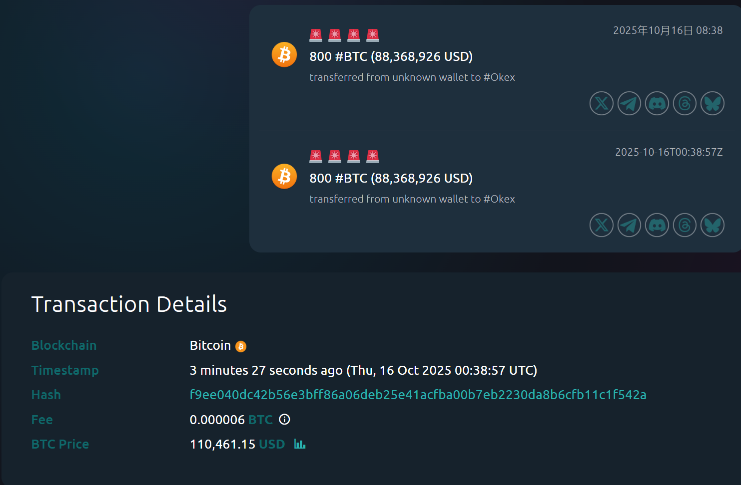 深潮 TechFlow 消息,10 月 16 日,据 Whale Alert 监测,某鲸鱼约 5 分钟前向 OKX 交易所转入 800 枚 BTC,价值约 8836.89 万美元。