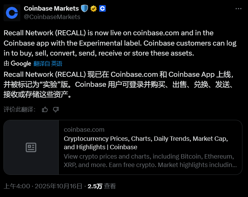 Coinbase 今日凌晨宣布已上线Yield Basis(YB)、Recall Network(RECALL)现货交易