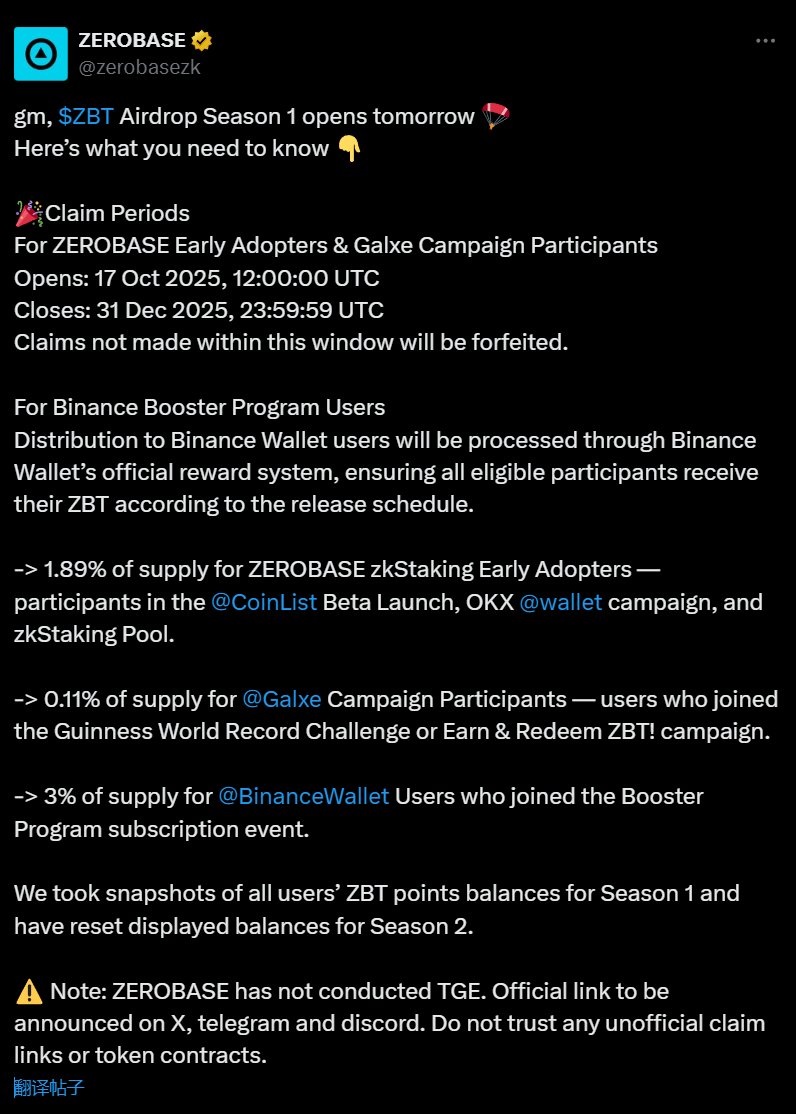 深潮 TechFlow 消息,10 月 16 日,据 ZEROBASE 官方披露,ZBT 代币第一季空投将于 10 月 17 日 20:00 UTC +8 正式开启。此次空投面向三类用户群体:ZEROBASE 早期采用者和 Galxe 活动参与者的领取窗口为 10 月 17 日至 12 月 31 日,逾期未领取将被没收;币安钱包 Booster 计划用户将通过币安钱包官方奖励系统进行分发。...