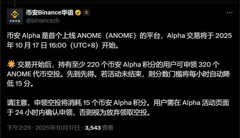 交易开始后,持有至少 220 个币安 Alpha 积分的用户可申领 320 个 ANOME 代币空投。先到先得。若活动未结束,则分数门槛将每小时自动降低 15 分。