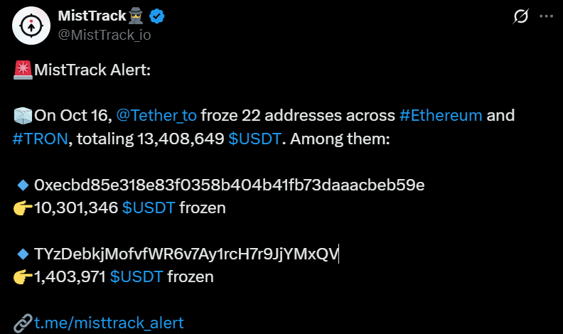 深潮 TechFlow 消息,10 月 16 日,据 MistTrack 监测,Tether 于 10 月 16 日在以太坊和波场网络上冻结了 22 个地址,总计 13,408,649 枚 USDT。