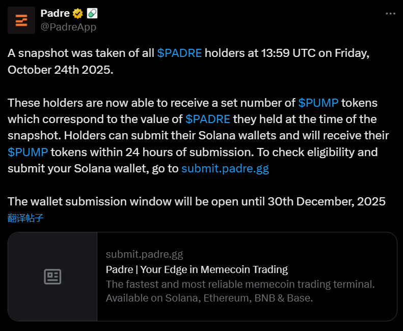根据快照结果,持有者现可获得相应数量的 PUMP 代币,空投数量与其在快照时持有的 PADRE 价值相对应。符合条件的持有者可提交其 Solana 钱包地址,并将在提交后 24 小时内收到 PUMP 代币。钱包提交窗口将开放至 2025 年 12 月 30 日。