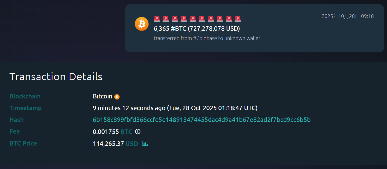 深潮 TechFlow 消息,10 月 28 日,据 Whale Alert 监测, 6,365 枚 BTC 约 10 分钟前从 Coinbase 转出至某未知新钱包,价值约 7.27 亿美元。
