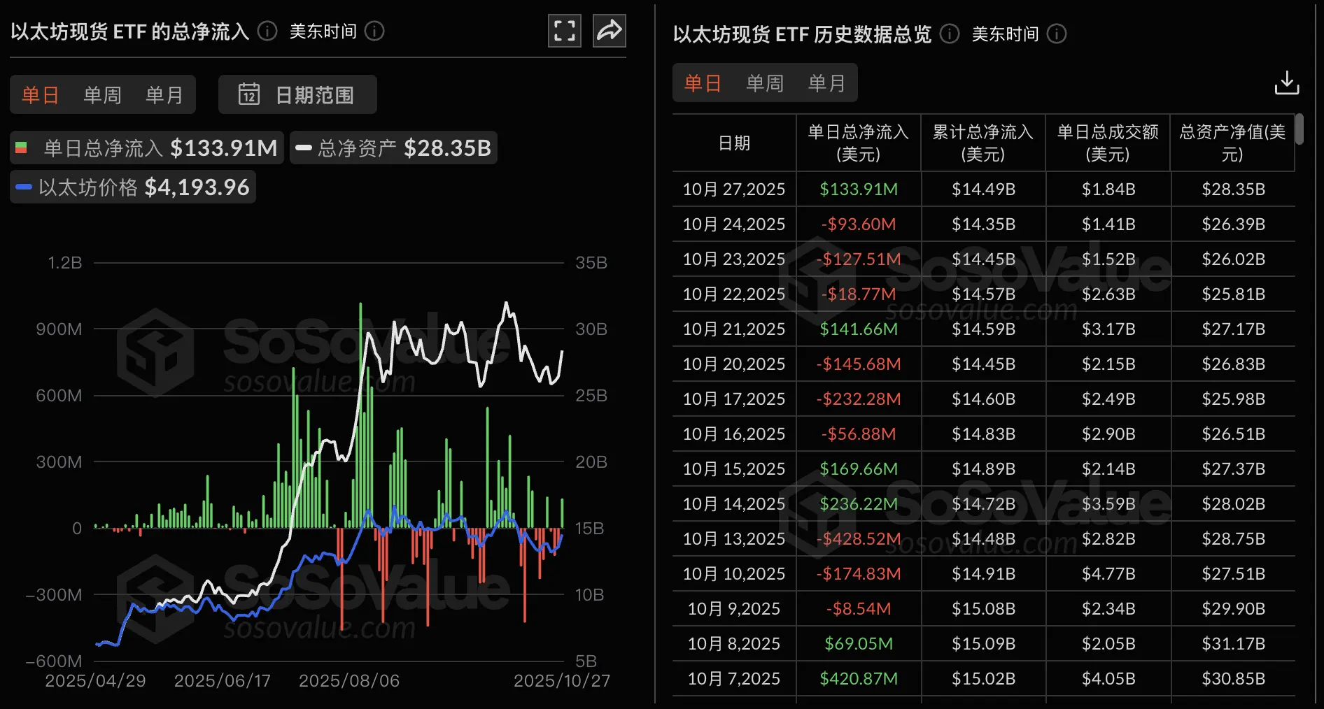 ChainCatcher 消息,根据 SoSoValue 数据,昨日(美东时间 10 月 27 日)以太坊现货 ETF 总净流入 1.34 亿美元。
