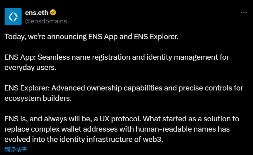 ENS 表示,该协议始终专注于用户体验优化。从最初解决复杂钱包地址问题、提供人类可读域名的解决方案,现已发展成为 Web3 的身份基础设施。