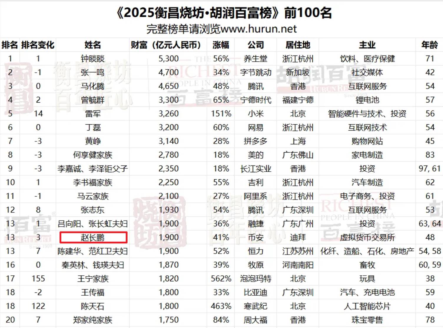 深潮 TechFlow 消息,10 月 28 日,据胡润研究院发布的《2025 衡昌烧坊·胡润百富榜》数据,币安创始人 CZ 以 1900 亿元人民币的财富位居该榜单第 13 位。