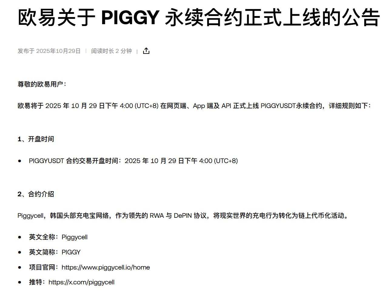 深潮 TechFlow 消息,10 月 29 日,据官方公告,OKX 将于 2025 年 10 月 29 日下午 4:00 (UTC+8) 在网页端、App 端及 API 正式上线 PIGGYUSDT永续合约,PIGGYUSDT 合约交易开盘时间:2025 年 10 月 29 日下午 4:00 (UTC+8)。