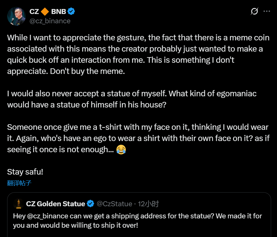 深潮 TechFlow 消息,10 月 29 日,针对 “CZ Golden Statue 制作赵长鹏(CZ)的形象金像”,CZ回应称,“虽然我很感激这份心意,但既然它还附带了表情包代币,那创作者很可能只是想利用我的互动赚点快钱。我不喜欢这种做法。别买这个 meme。”