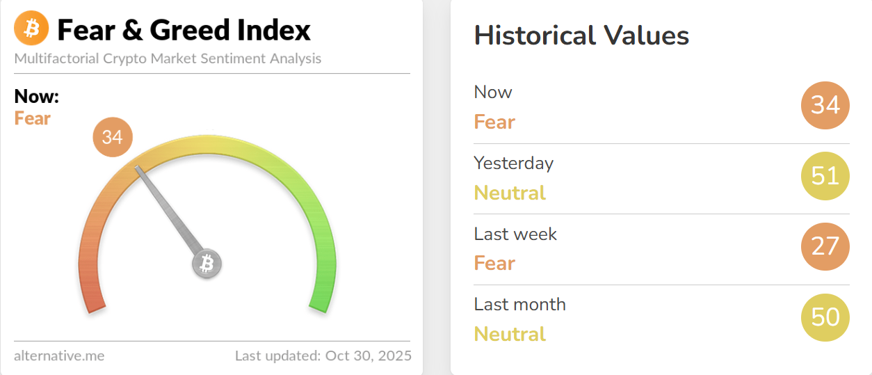 深潮 TechFlow 消息,10 月 30 日,据 Alternative.me 数据,今日加密货币恐慌与贪婪指数降至 34(昨日该指数为 51),表明市场由「中性状态」转为「恐慌状态」。