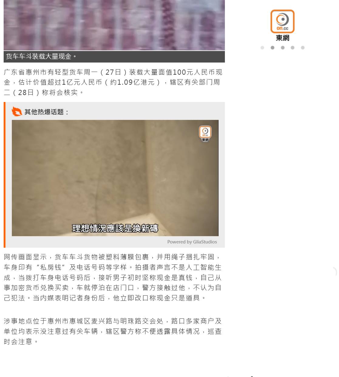深潮 TechFlow 消息,10 月 30 日,据港媒东网报道,10 月 27 日广东省惠州市一辆轻型货车装载大量面值 100 元人民币现金,估计价值超过 1 亿元人民币。