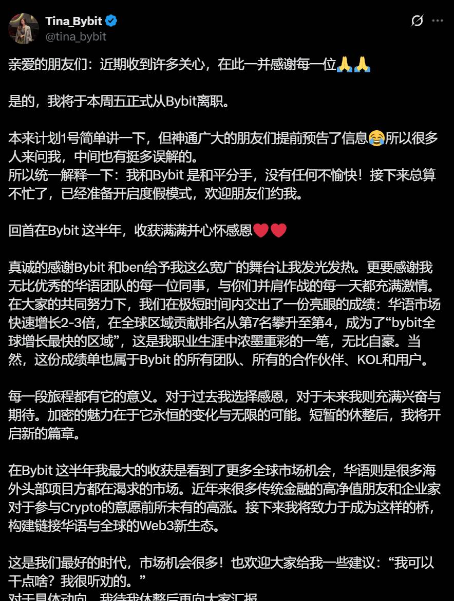 深潮 TechFlow 消息,10 月 30 日,Bybit 华语负责人 Tina 在社交媒体平台发文宣布将于 10 月 31 日(本周五)离职,Tina 表示,与 Bybit 是和平分手,没有任何不愉快。