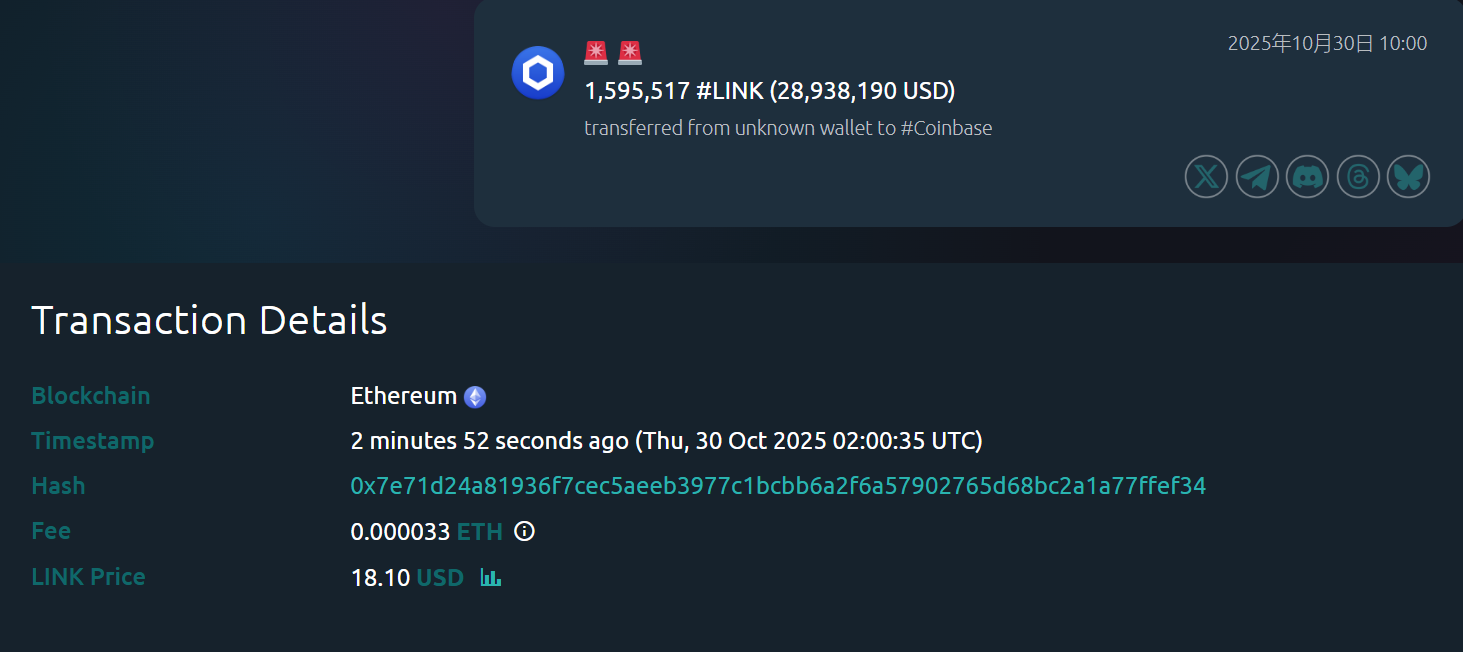 深潮 TechFlow 消息,10 月 30 日,据 Whale Alert 监测,159.55 万枚 LINK 代币从未知钱包转入 Coinbase 交易所,转账价值约 2893.82 万美元。