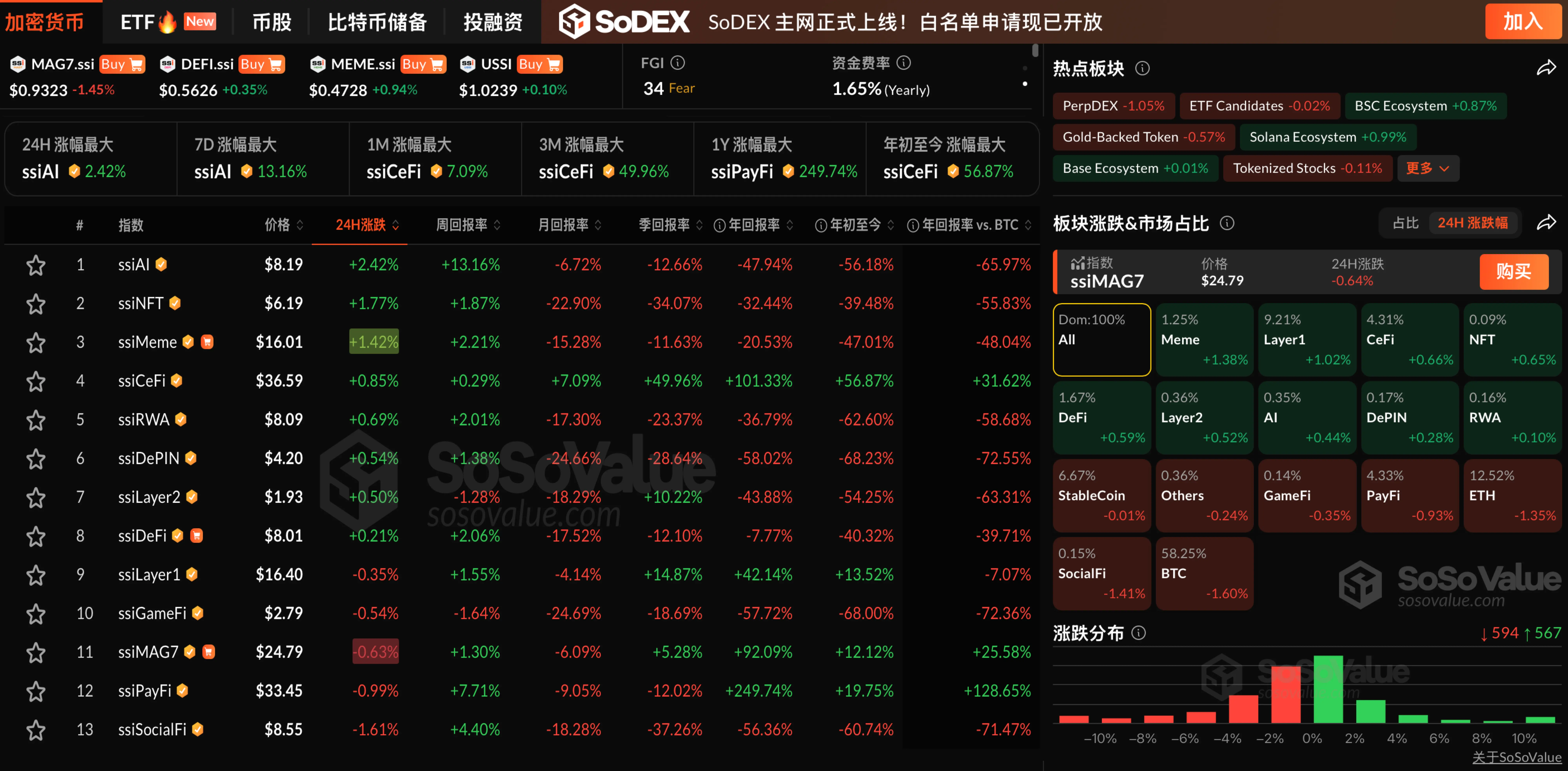反映板块历史行情的加密板块指数显示,ssiAI、ssiNFT、ssiMeme 指数分别上涨 2.42%、1.77%、1.42%。