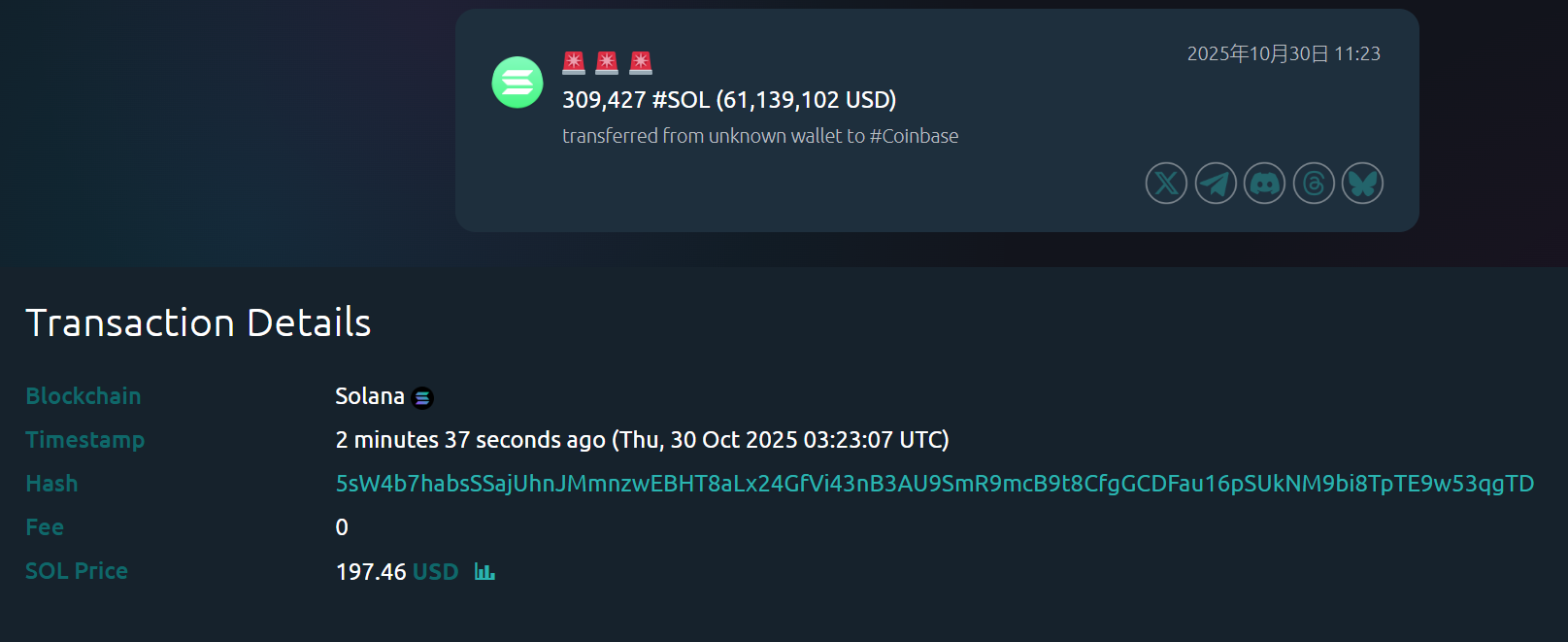 某鲸鱼约 3 分钟前向 Coinbase 转入 30.9 万枚 SOL,价值约 6114 万美元