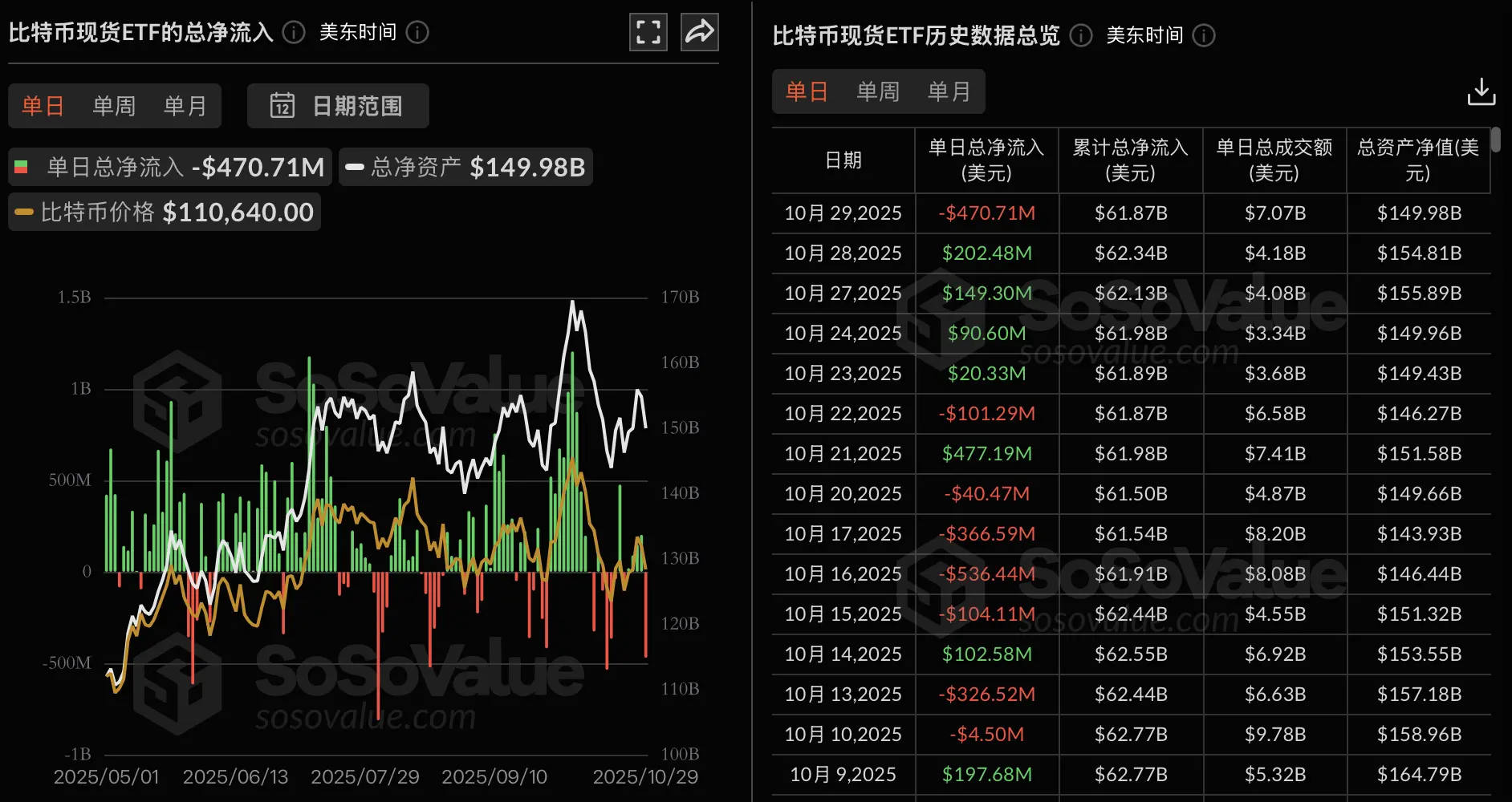 ChainCatcher 消息,根据 SoSoValue 数据,昨日(美东时间 10 月 29 日)比特币现货 ETF 总净流出 4.71 亿美元。