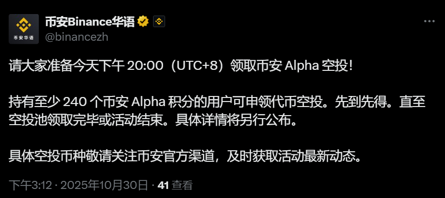 深潮 TechFlow 消息,10 月 30 日,据官方公告,请大家准备今天下午 20:00(UTC+8)领取币安 Alpha 空投。持有至少 240 个币安 Alpha 积分的用户可申领代币空投。先到先得。直至空投池领取完毕或活动结束。具体详情将另行公布。具体空投币种敬请关注币安官方渠道,及时获取活动最新动态。