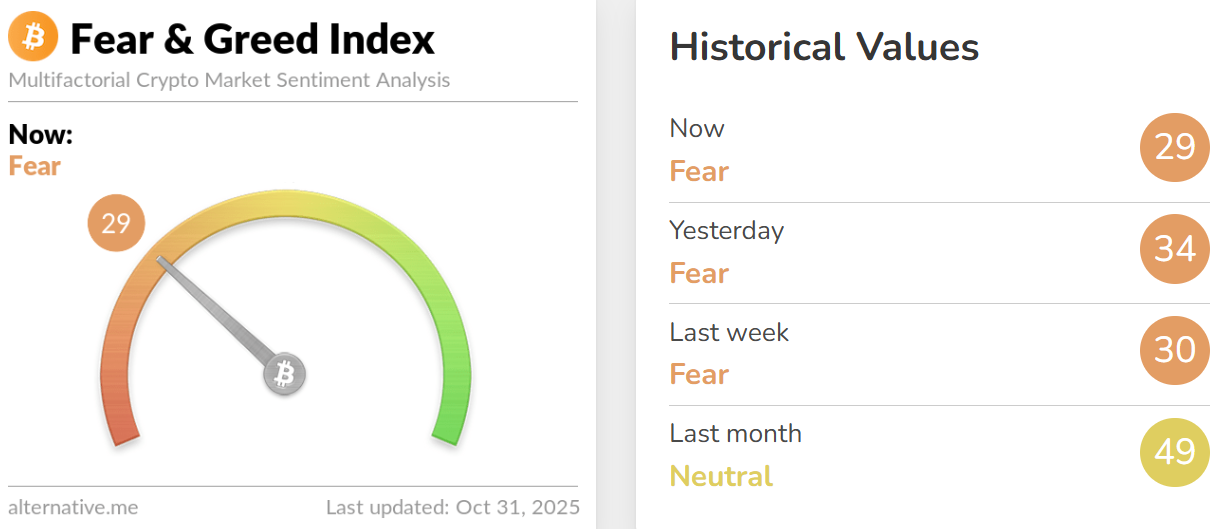 深潮 TechFlow 消息,10 月 31 日,据 Alternative.me 数据,今日加密货币恐慌与贪婪指数降至 29(昨日该指数为 34),表明市场仍处于「恐慌状态」。