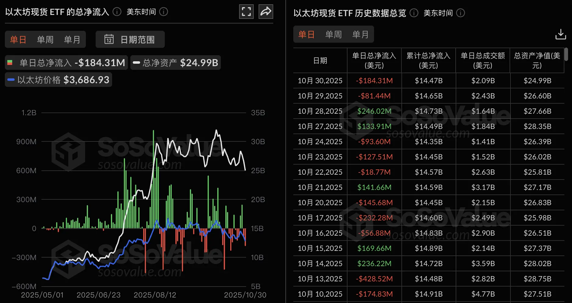 ChainCatcher 消息,根据 SoSoValue 数据,以太坊现货 ETF 昨日总净流出 1.84 亿美元。昨日单日净流出最多的以太坊现货 ETF 为贝莱德(Blackrock) ETF ETHA,单日净流出为 1.18 亿美元,目前 ETHA 历史总净流入达 142.06 亿美元。其次为 Bitwise ETF ETHW,单日净流出为 3114.43 万美元,目前 ETHW 历史总净流...