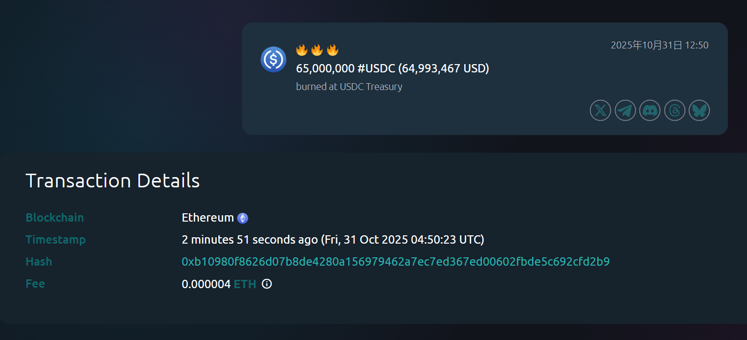 深潮 TechFlow 消息,10 月 31 日,据 Whale Alert 监测,USDC Treasury 再次在以太坊链上销毁了 65,000,000 枚 USDC。