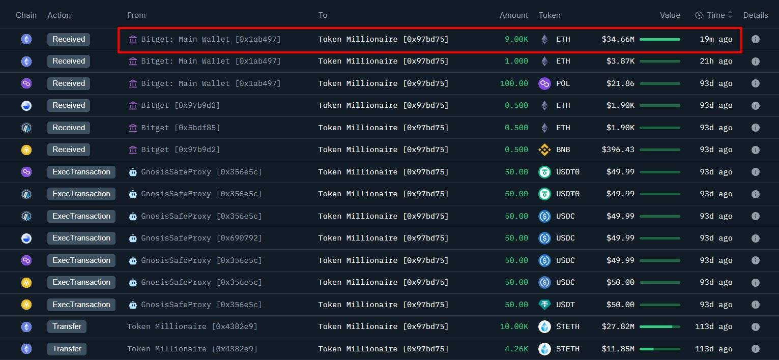 深潮 TechFlow 消息,10 月 31 日,据 Onchain Lens 监测,某鲸鱼在沉寂 3 个月后从 BitGet 提取 9,000 枚 ETH,价值 3,466 万美元。
