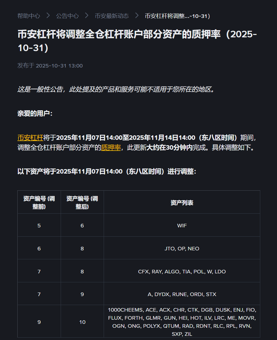 深潮 TechFlow 消息,10 月 31 日,据官方公告,币安杠杆将于2025年11月07日14:00至2025年11月14日14:00(东八区时间)期间,调整全仓杠杆账户部分资产的质押率,此更新大约在30分钟内完成。