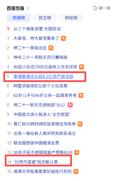 深潮 TechFlow 消息,10 月 31 日,“比特币富婆”钱志敏认罪和“柬埔寨电诈头目陈志8.2亿资产被冻结”登上百度热搜榜,“比特币富婆”钱志敏认罪位列第14位,“柬埔寨电诈头目陈志8.2亿资产被冻结”位列第5位。此前消息,财新网披露新加坡警方今日公布已对“太子集团”首脑陈志及其同伙展开执法行动,查封总价值超过1.5亿新元(约合人民币8.2亿元)的资产。 ...