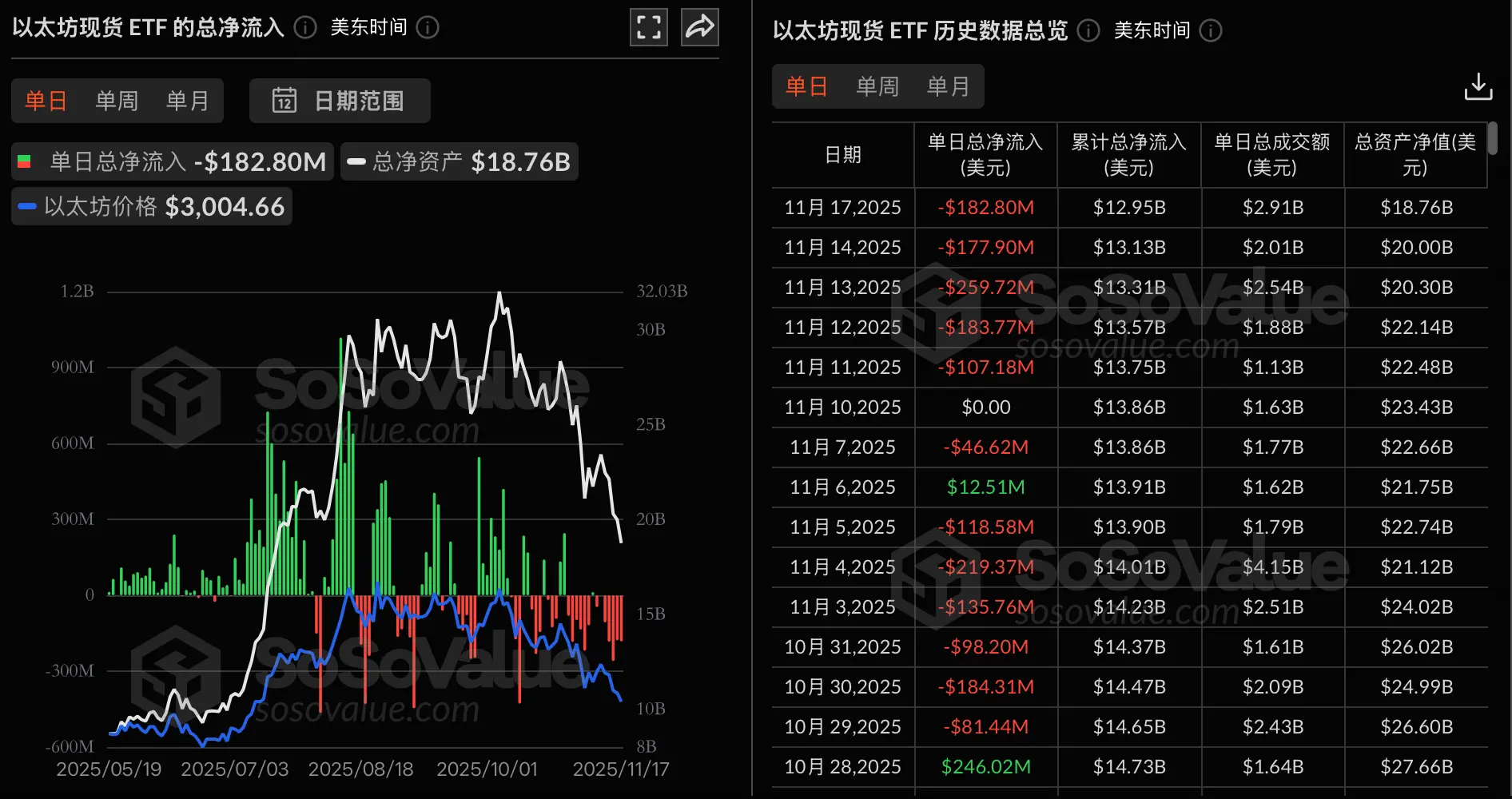 ChainCatcher 消息,根据 SoSoValue 数据,昨日(美东时间 11 月 17 日)以太坊现货 ETF 总净流出 1.83 亿美元。