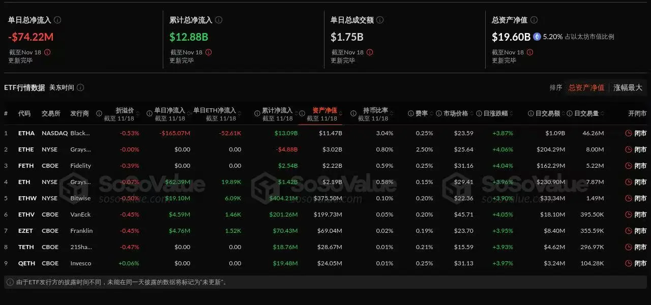 截至发稿前,以太坊现货 ETF 总资产净值为 195.96 亿美元,ETF 净资产比率(市值较以太坊总市值占比)达 5.2%,历史累计净流入已达 128.75 亿美元。