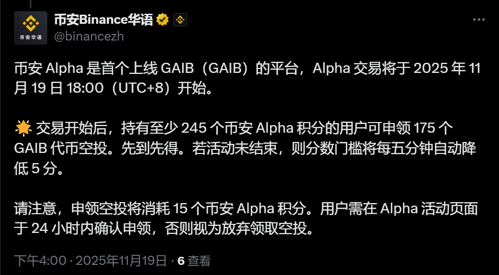 交易开始后,持有至少 245 个币安 Alpha 积分的用户可申领 175 个 GAIB 代币空投。先到先得。若活动未结束,则分数门槛将每五分钟自动降低 5 分。