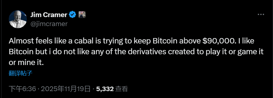 深潮 TechFlow 消息,11 月 19 日,CNBC 节目主持人、前对冲基金经理 Jim Cramer 在社交媒体发文表示,"感觉像是有一股幕后势力试图将 BTC 价格维持在 9 万美元以上。我喜欢 BTC,但我不喜欢任何为了操纵它而创造的衍生品。"