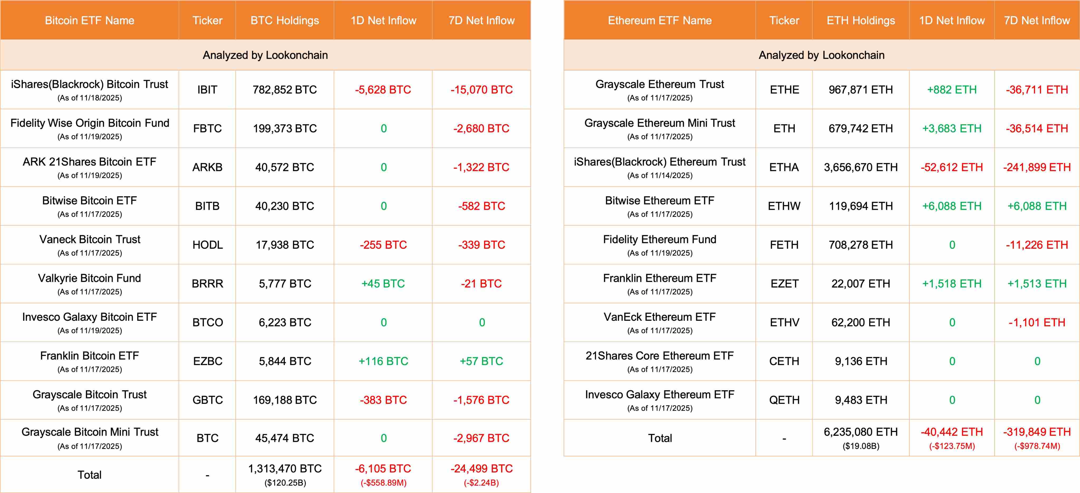 深潮 TechFlow 消息,11 月 19 日,据 Lookonchain 监测,截止于发稿,今日 10 只比特币 ETF 净流出 6,105 枚 BTC(价值 5.5889 亿美元),9 只以太坊 ETF 净流出 40,442 枚 ETH(价值 1.2375 亿美元)。