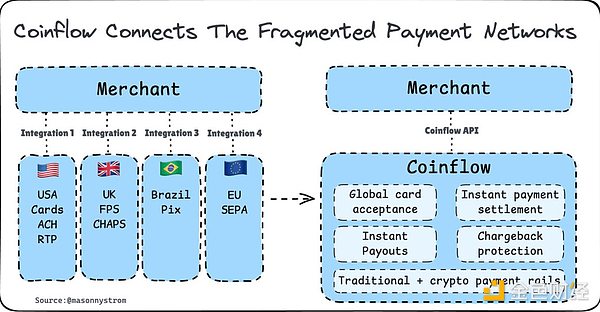 然而,尽管金融本质推动支付系统追求效率,但也引入了自身的无序性,导致支付网络杂乱无章,每个网络都增加了一层集成复杂性,却未能解决结算速度、碎片化或风险管理等根本问题。于是,稳定币和Coinflow应运而生。