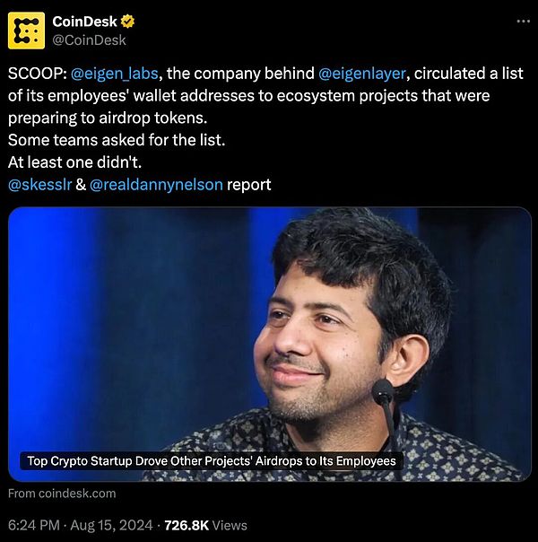 随后是利益冲突丑闻。2024 年 8 月,CoinDesk 报道称,Eigen Labs 员工从基于 EigenLayer 的项目中获得了近 500 万美元的空投。员工集体从 EtherFi、Renzo 和 Altlayer 等项目中认领了数十万代币。至少有一个项目迫于压力,将员工纳入其分配范围。