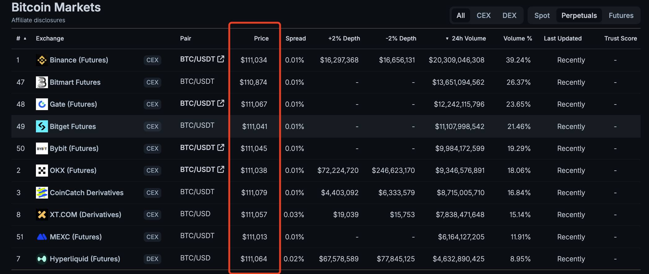 通过上面这张 BTC 的永续合约报价表,你会发现成交量最大的前十名交易所的报价没有一个是一样的。