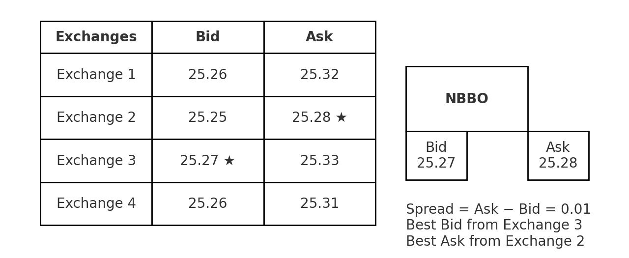 NBBO(National Best Bid and Offer,全国最佳买卖价):把所有交易所的最佳买价和最佳卖价组合起来,成为衡量是否「穿透」的统一标尺。例如,上图 Exchange 3 的 25.27 是最佳买价,Exchange 2 的 25.28 是最佳卖价。