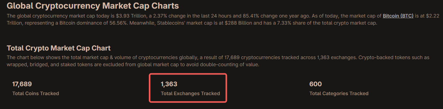 放眼当下,全球被统计在册的加密交易场所动辄上千:仅 CoinGecko 的「全球图表」就显示追踪 1,300+ 交易所(如下图);而 CoinMarketCap 的现货榜单也长期显示两百余家在活跃报量——这还不含各类衍生品与链上 DEX 的长尾场所。这样的版图,意味着没有谁能天然看到「全市场最优价」。