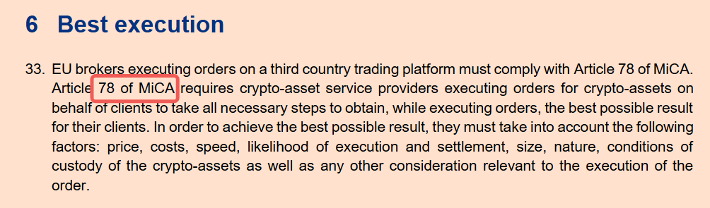 原则先行(同一合规圈层): 在单一司法辖区的合规平台 / 经纪 / 聚合器之间,确立「不得穿透更优公开价格 / 净价」的明确义务。什么叫「净价」?不只看屏幕上的名义价,还要把费用、返佣、滑点、Gas、失败重试成本都算进去。欧盟 MiCA 第 78 条 已经把「最佳结果」写成法定清单(价格、成本、速度、执行与结算可能性、规模、托管条件等);这一原则性口径,完全可以成为「加密版防穿透」的锚。(esma.europa.eu, wyden.io)